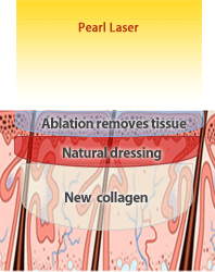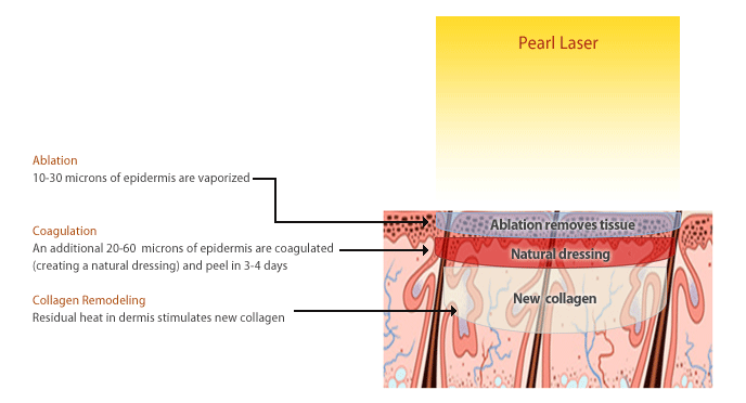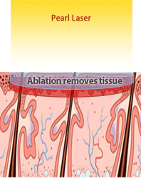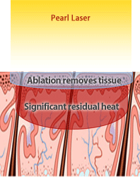 Er:YAG 2.94µm primarily vaporizes tissue due to its high water absorption. Heat is confined in the epidermis. No hemostasis. | CO2 10.6µm, the margin between a safe, repeatable ablation and overheating the dermis is narrow as evidenced with numerous cases of non-transient pigmentation changes. | The goal for our YSGG 2.79µm is to ablate and coagulate to a controllable depth of epidermis while depositing some heat into the dermis, promoting new collagen. |